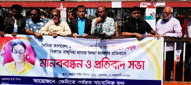 ফেনীর পরশুরাম উপজেলার কালবেলার প্রতিনিধি আবু ইউসুফ মিন্টুকে একটি হত্যা মামলায় জড়ানোর প্রতিবাদে ফেনীর সাংবাদিকরা মানববন্ধন ও প্রতিবাদ সভা করেছেন।